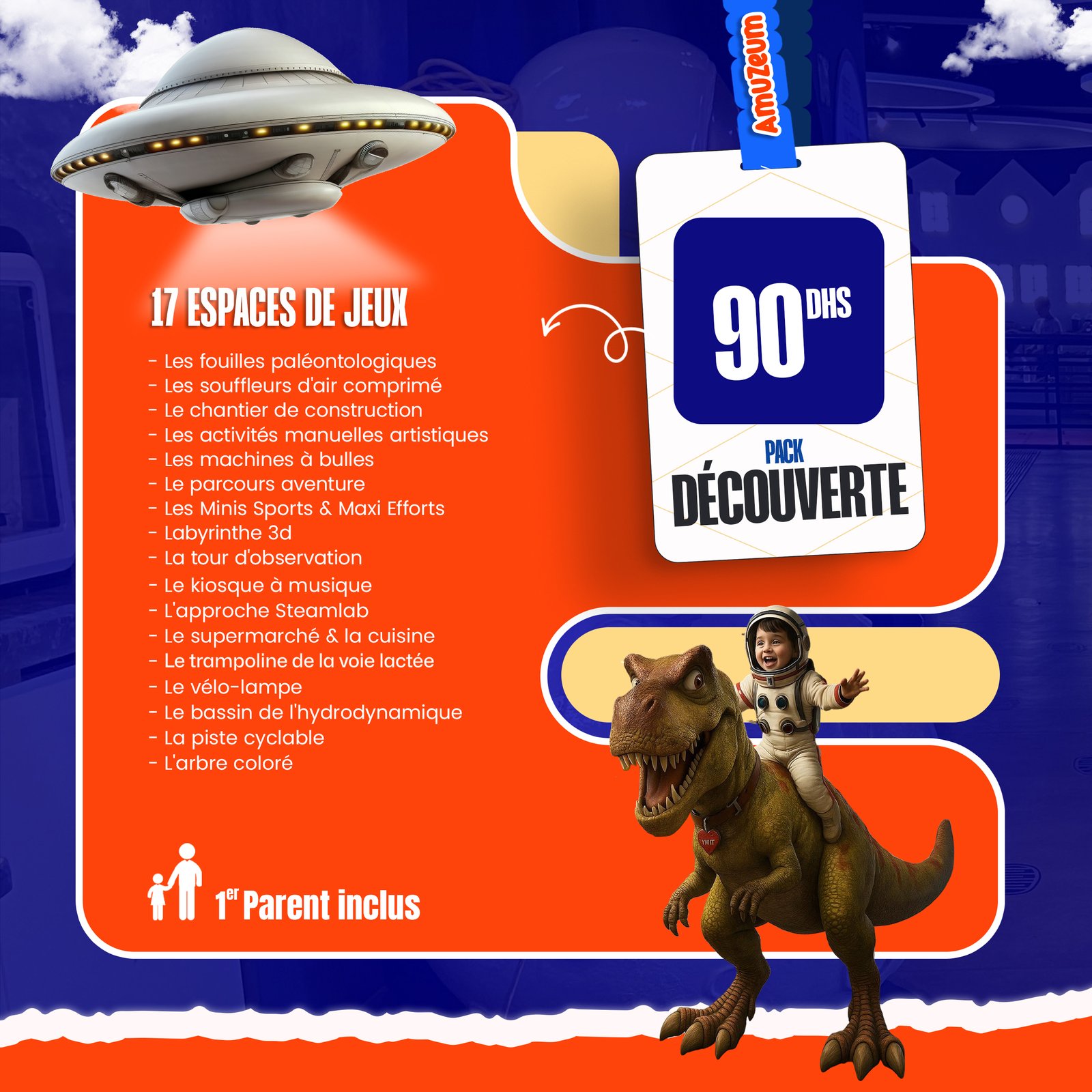 - Un ticket d’entrée donne accès à 17 espaces de jeux (fouilles paléontologiques, chantier de construction, machines à bulles, labyrinthe 3D, vélo-lampe, piste cyclable, bassin d’hydrodynamique, supermarché & cuisine, kiosque à musique, approche STEAMlab, etc.).